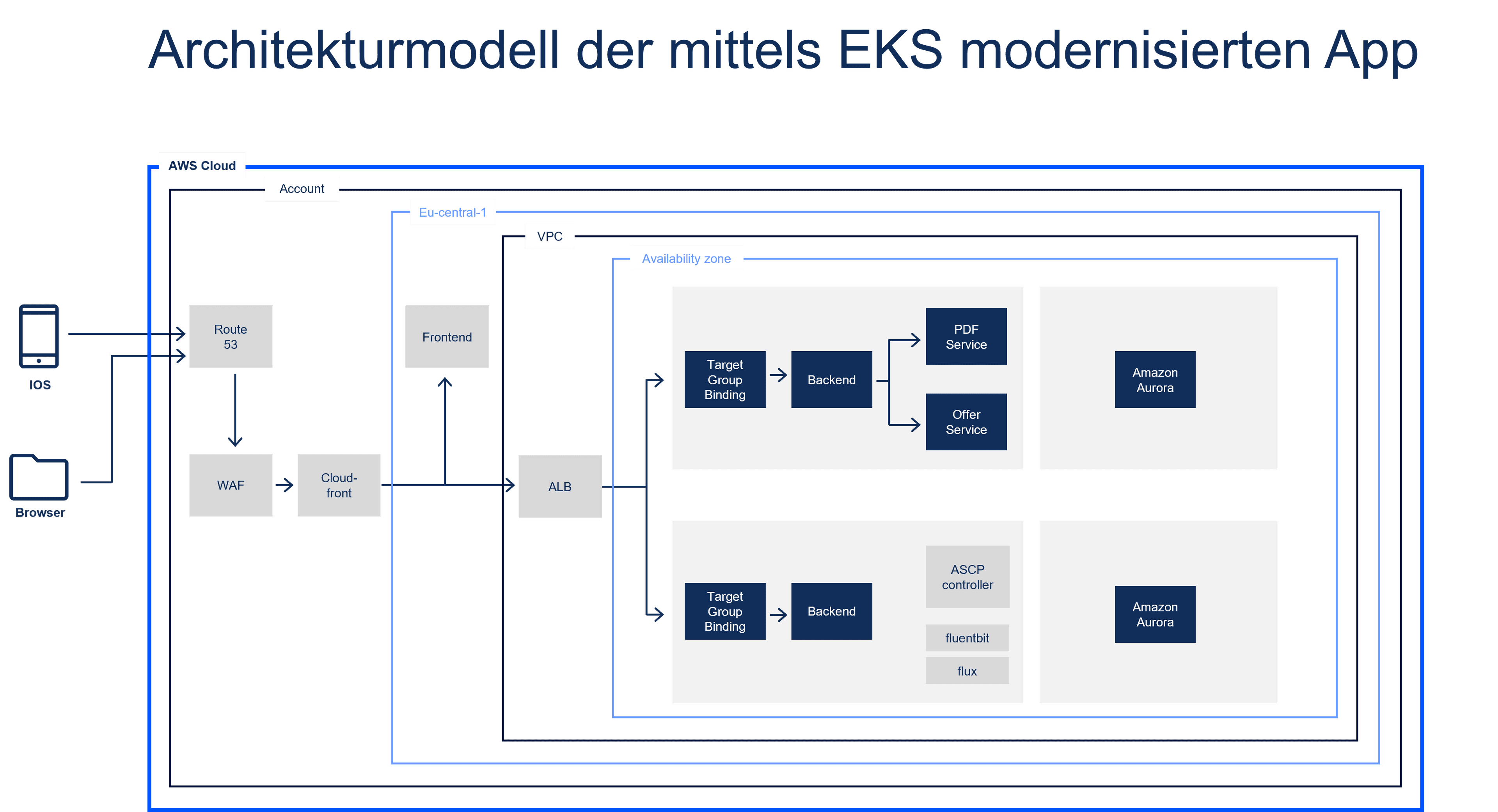 Rechenleistung: Amazon EKS hostet das Backend der Anwendung, das mit Microservices aufgebaut ist und durch die Ausführung und Skalierung über mehrere AWS-Verfügbarkeitszonen Downtimes minimiert. Als verwaltete Kubernetes-Plattform werden Tools wie FluxCD für die kontinuierliche Bereitstellung eingesetzt.