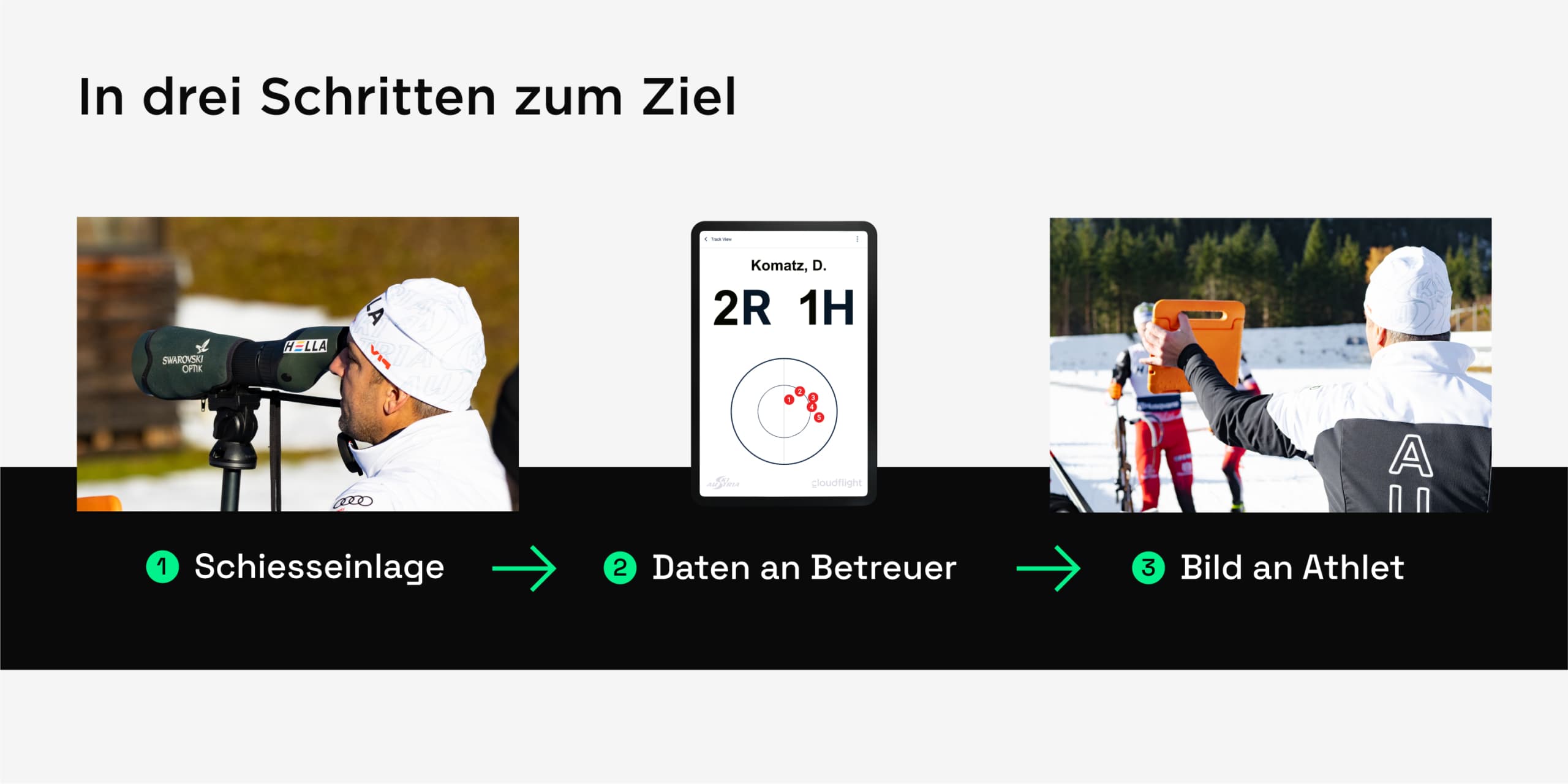 „Das Programm ist für uns Athleten eine große Unterstützung. Wir bekommen damit nicht nur die Info, wie wir am Schießplatz reagieren müssen, sondern sehen auch jeden einzelnen Schuss und können die Anweisungen während des Rennens nachvollziehen.“ David Komatz, österreichischer Spitzensportler und Gewinner der Silbermedaille bei der Biathlon-WM 2021 in Pokljuka