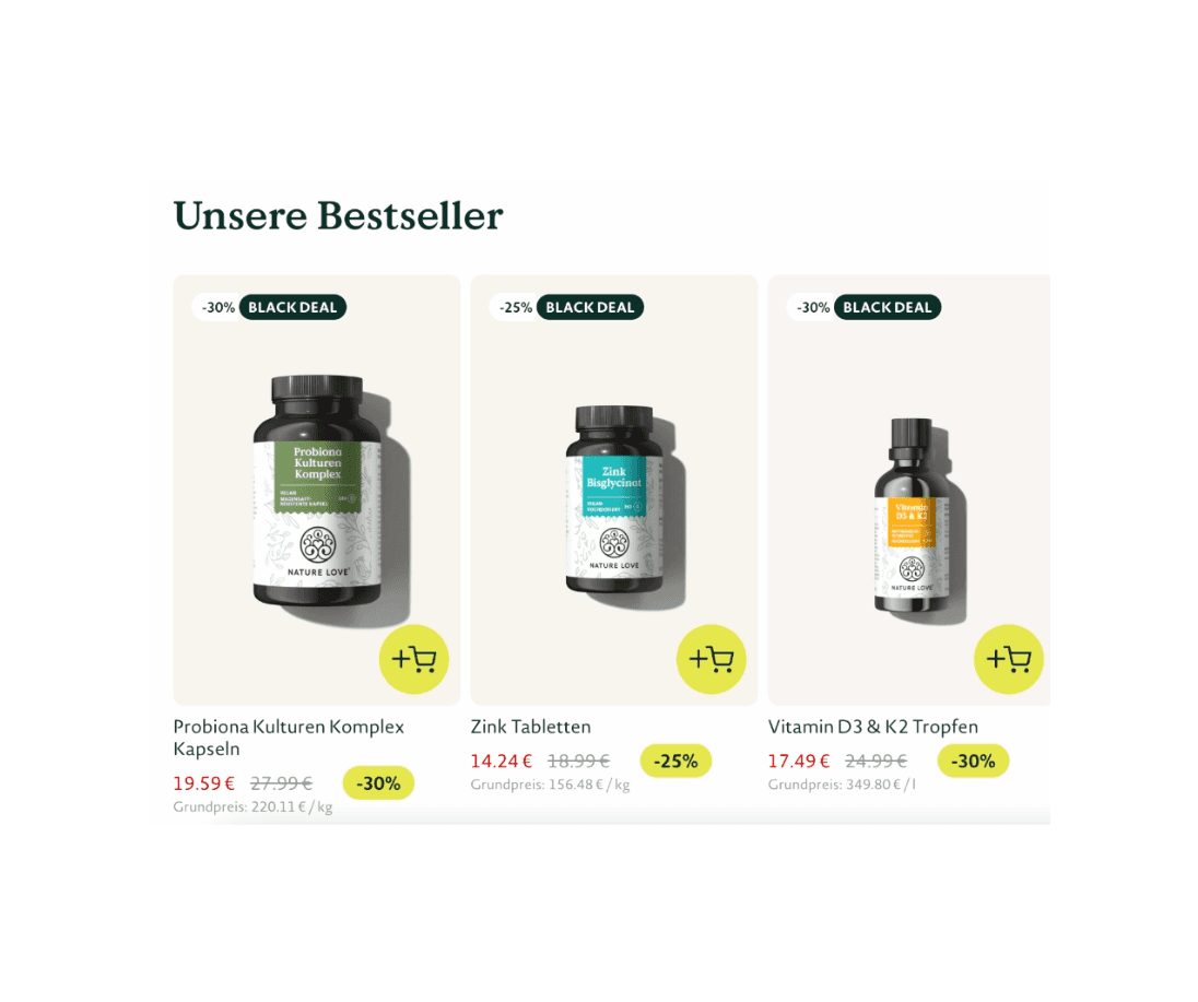 Das Store-Design konzentrierte sich auf einen kundenorientierten Ansatz und schuf eine visuell ansprechende und intuitive Einkaufserfahrung, die perfekt zur Markenidentität von Nature Love passt. Dank der Skalierbarkeit und Flexibilität von Shopify Plus konnten wir den Shop kontinuierlich optimieren und eine solide Grundlage für das zukünftige Wachstum der Marke schaffen.