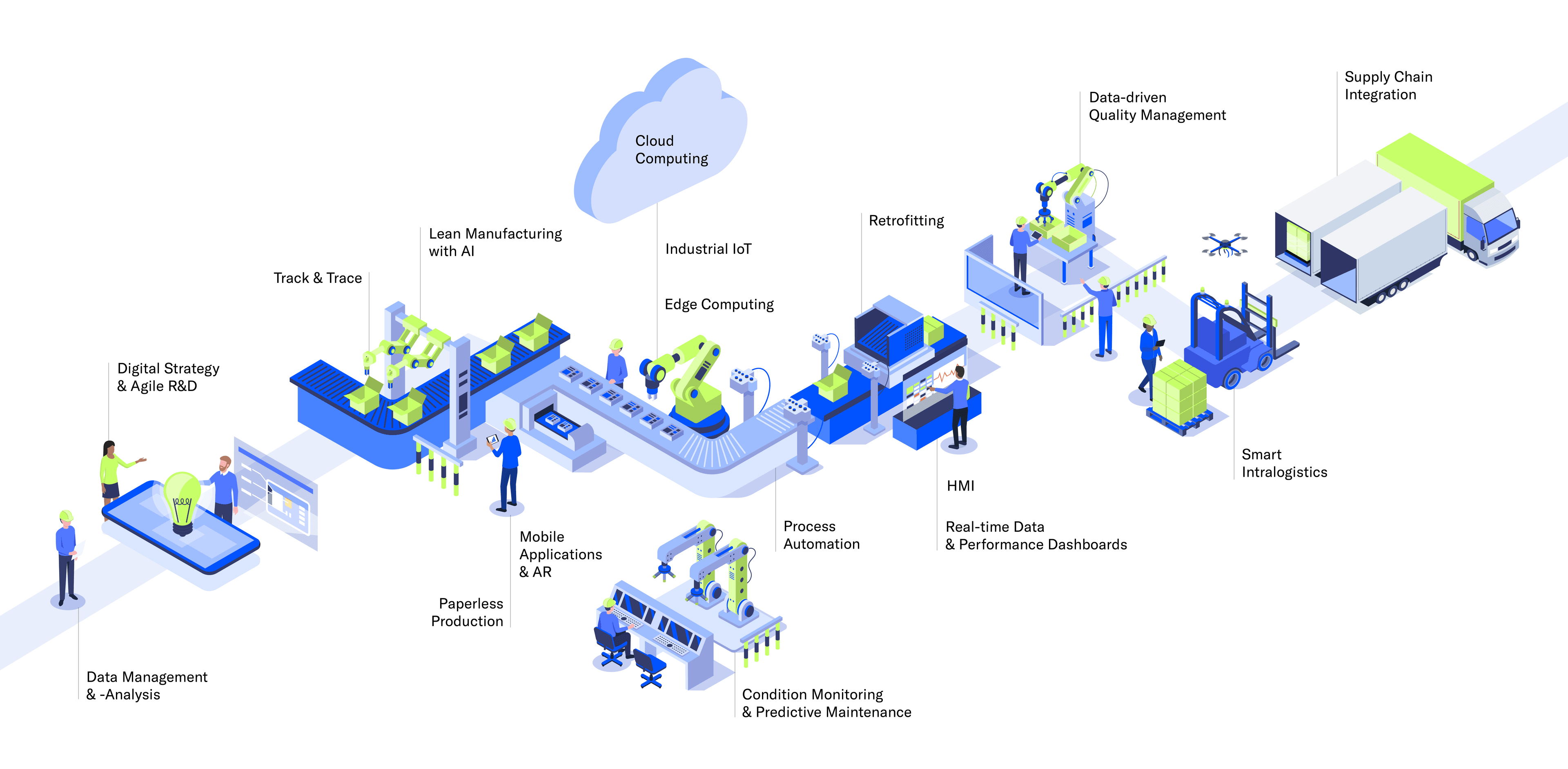 We develop solutions like data-driven quality management, track & trace, and digital twin technologies, empowering manufacturers to make informed decisions based on accurate, real-time data. These soltuions aim to enhance quality control, supply chain visibility, and product lifecycle management, crucial for optimizing production efficiency and product quality.