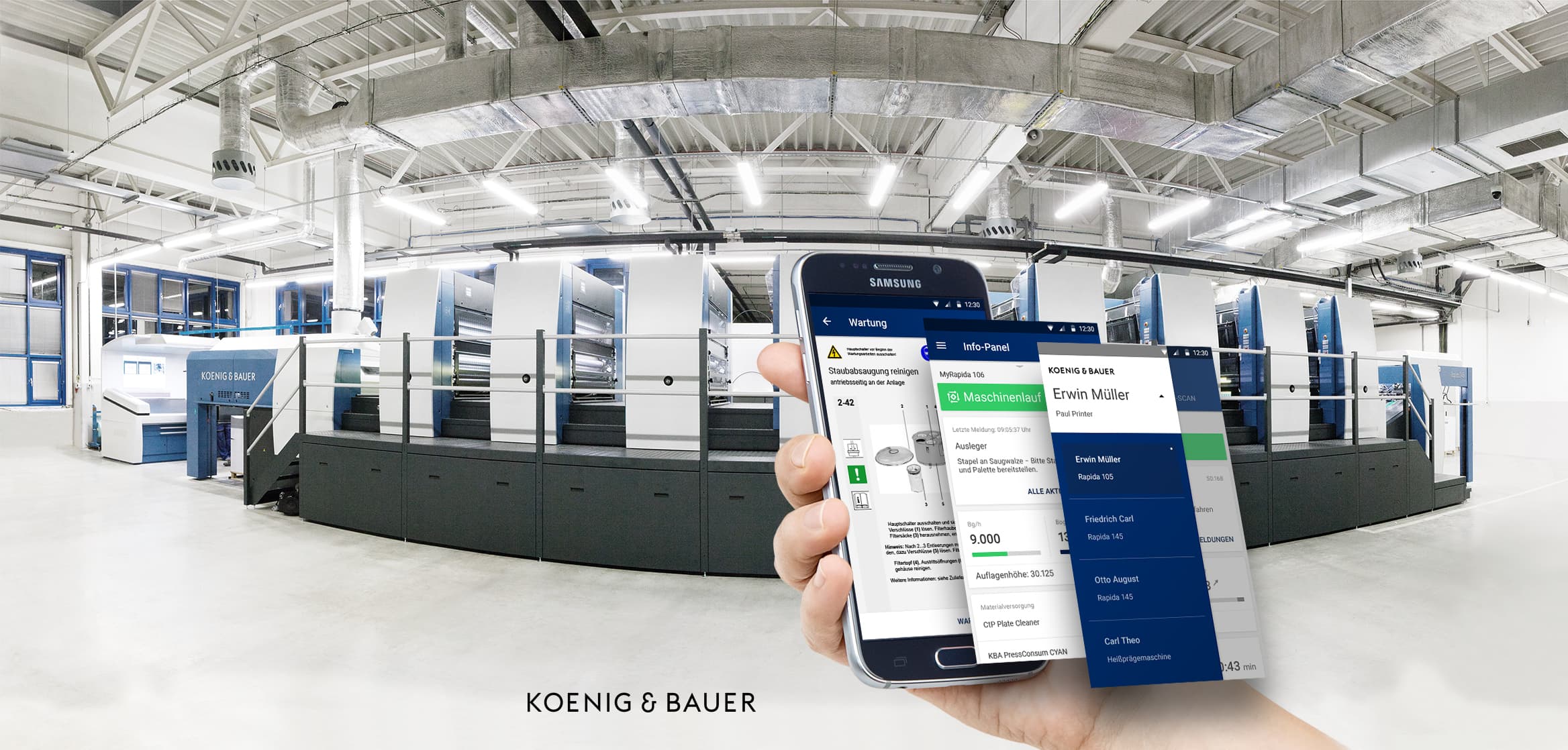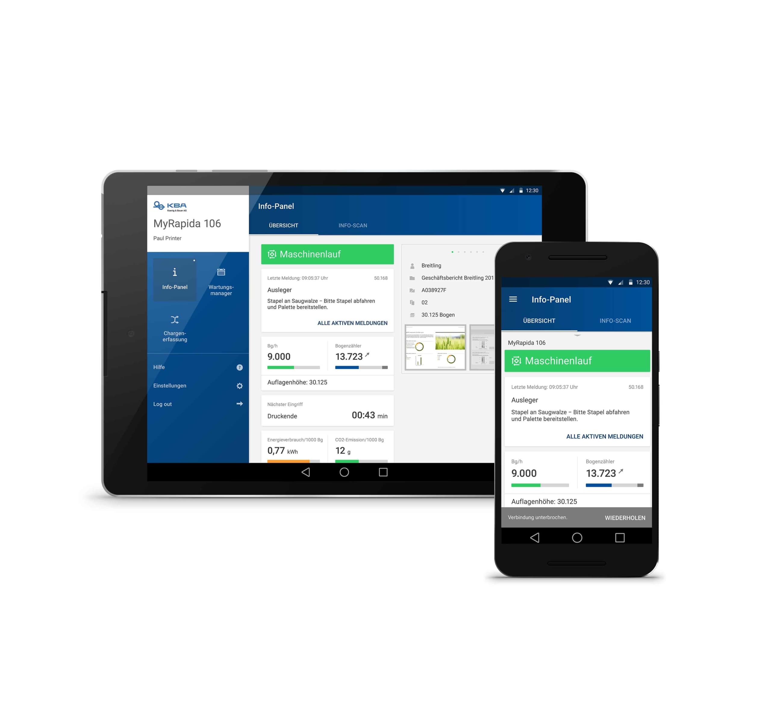 The use of a smartphone app formed the basis for detached information processing. The Rapida LiveApp supports operators in monitoring and controlling sheetfed offset presses. Thanks to secure log-in at the console, users can clearly call up the status, progress check and pending maintenance jobs of the print production, regardless of location. In addition, the app provides access to batch recording for seamless tracking of consumables, as well as to the manual, instructions and documentation for the press.