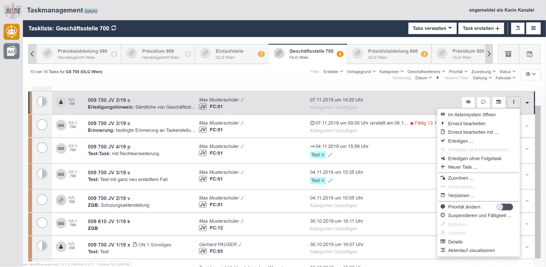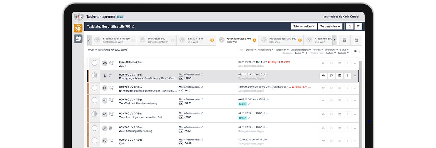 The digital justice workspace (DJA) portal appears similar to the concept known from a web browser, that shows specific windows in separate tabs. All necessary web – and rich client applications are accessible via the menu on the left side of the screen. A uniform appearance and behavior of various areas help the users find their way faster and more easily. To further boost workflow efficiency, the system also takes into consideration different work modes (preparation, trial, etc.) and workplace situations (multiple monitors, public trials with projector, mobile workplace, etc.).
